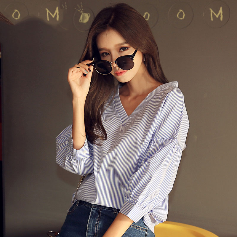 商品名称:韩都衣舍2017韩版女装春装新款条纹显瘦百搭宽松v领七分袖衬衫潮 领券立减/单件包邮/七天无理由退换