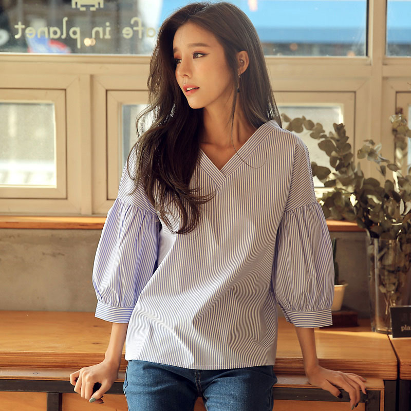 韩都衣舍2017韩版女装春装新款条纹显瘦百搭宽松v领七分袖衬衫潮 领券立减/单件包邮/七天无理由退换